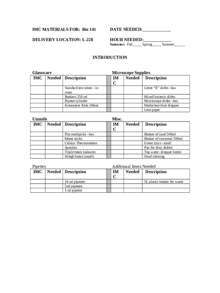 Instructions for the IMC MATERIALS FOR: Bio 142 - Histology Lab - natsci parkland form