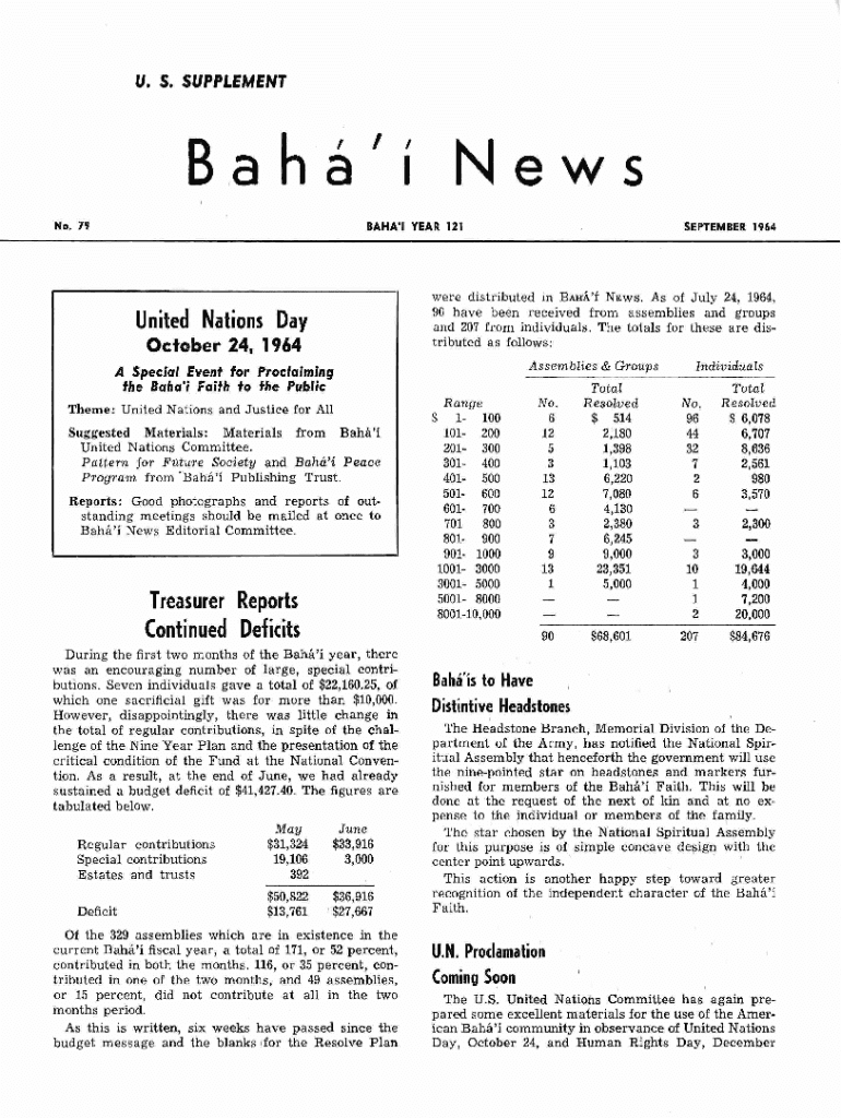 U. S. SUPPLEMENTBaha\'i News No. 79BAHA\'I YEAR 121SEPTEMBER 1964\' AS of July 24, 1964, were distributed m B A NEWS. 90 have been received from assemblies and groups and 207 from individuals. The