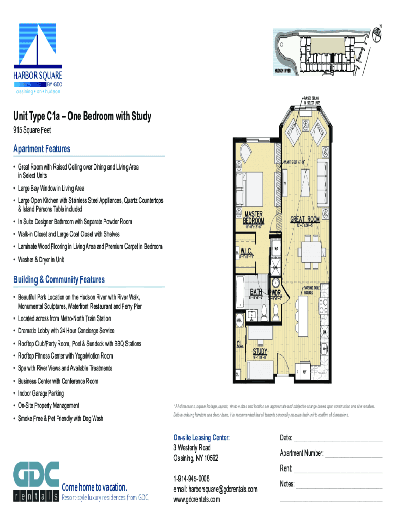 NHARBOR SQUARE BY GDC o ssin in g o n hudso nUnit Type C1a One Bedroom with Study 915 Square FeetApartment Features Great Room with Raised Ceiling over Dining and Living Area in Select Units Large