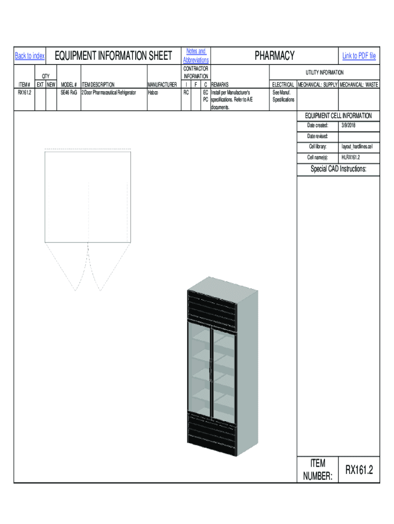 Back to indexITEM # RX161.2EQUIPMENT INFORMATION SHEETQTY EXT NEWMODEL # SE46 RxGITEM DESCRIPTION 2 Door Pharmaceutical RefrigeratorMANUFACTURER HabcoNotes and Abbreviations CONTRACTOR INFORMATION