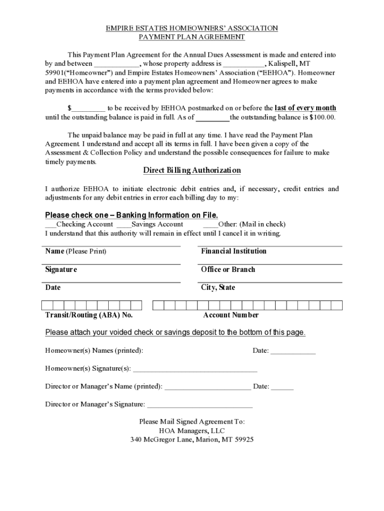 EMPIRE ESTATES HOMEOWNERS ASSOCIATION PAYMENT PLAN AGREEMENT This Payment Plan Agreement for the Annual Dues Assessment is made and entered into by and between ___, whose property address is ___,