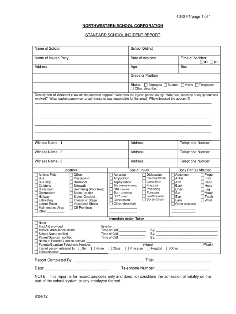 4340 F1/page 1 of 1 NORTHWESTERN SCHOOL CORPORATION STANDARD SCHOOL INCIDENT REPORTName of SchoolSchool DistrictName of Injured PartyDate of AccidentTime of AccidentAddressAgeSex am pmGrade or Position