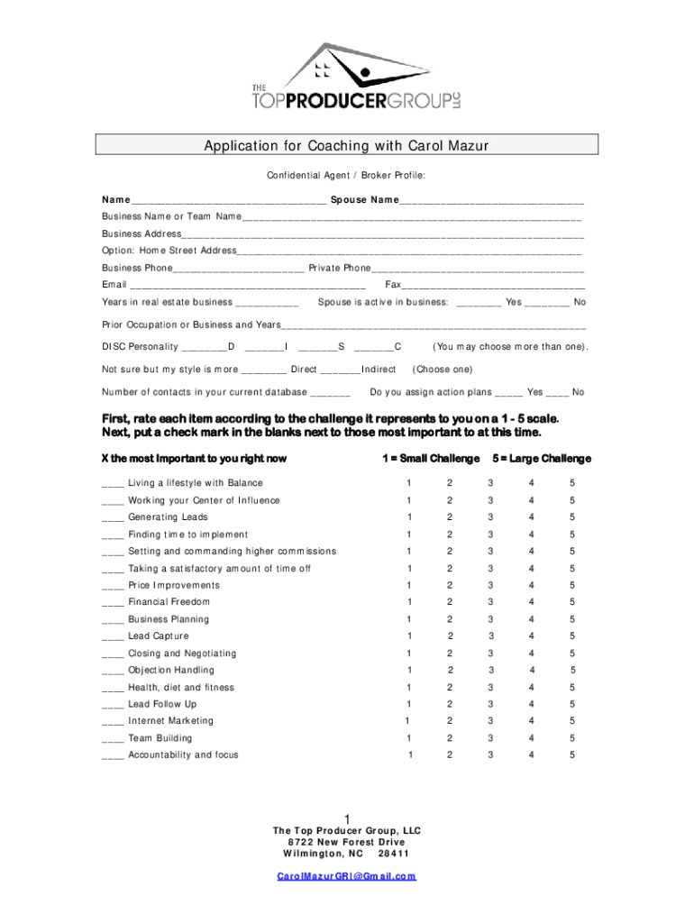 Application for Coaching with Carol Mazur Confidential Agent / Broker Profile: Name___ Spouse Name___ Business Name or Team Name___ Business Address___ Option: Home Street Address___ Business Phone___