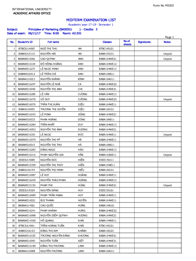 Form No M9205 .INTERNATIONAL UNIVERSITY ACADEMIC AFFAIRS OFFICEMIDTERM EXAMINATION LIST Academic year 1718 Semester 1 Subject: Principles of Marketing (BA003IU ) Credits: 3 Date of exam: 06/11/17
