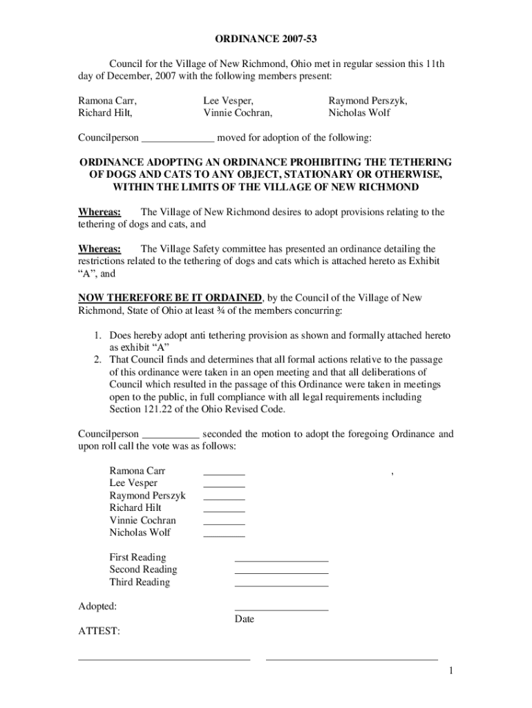 ORDINANCE 200753 Council for the Village of New Richmond, Ohio met in regular session this 11th day of December, 2007 with the following members present: Ramona Carr, Richard Hilt,Lee Vesper, Vinnie