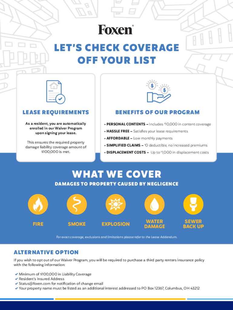 LETS CHECK COVERAGE OFF YOUR LISTLEASE REQUIREMENTSBENEFITS OF OUR PROGRAMAs a resident, you are automatically enrolled in our Waiver Program upon signing your lease. PERSONAL CONTENTS Includes $10,000