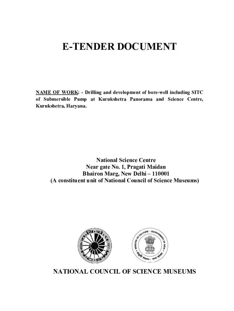 ETENDER DOCUMENTNAME OF WORK: Drilling and development of borewell including SITC of Submersible Pump at Kurukshetra Panorama and Science Centre, Kurukshetra, Haryana.National Science Centre Near