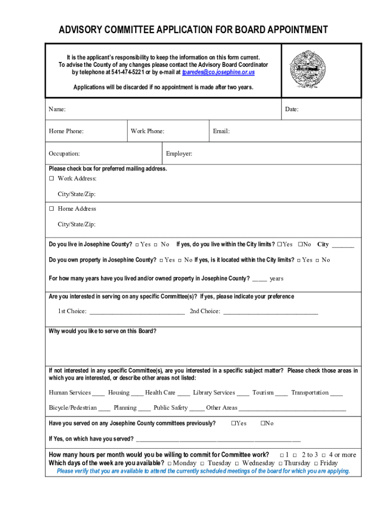 ADVISORY COMMITTEE APPLICATION FOR BOARD APPOINTMENT It is the applicants' responsibility to keep the information on this form current. To advise the County of any changes please contact the Advisory