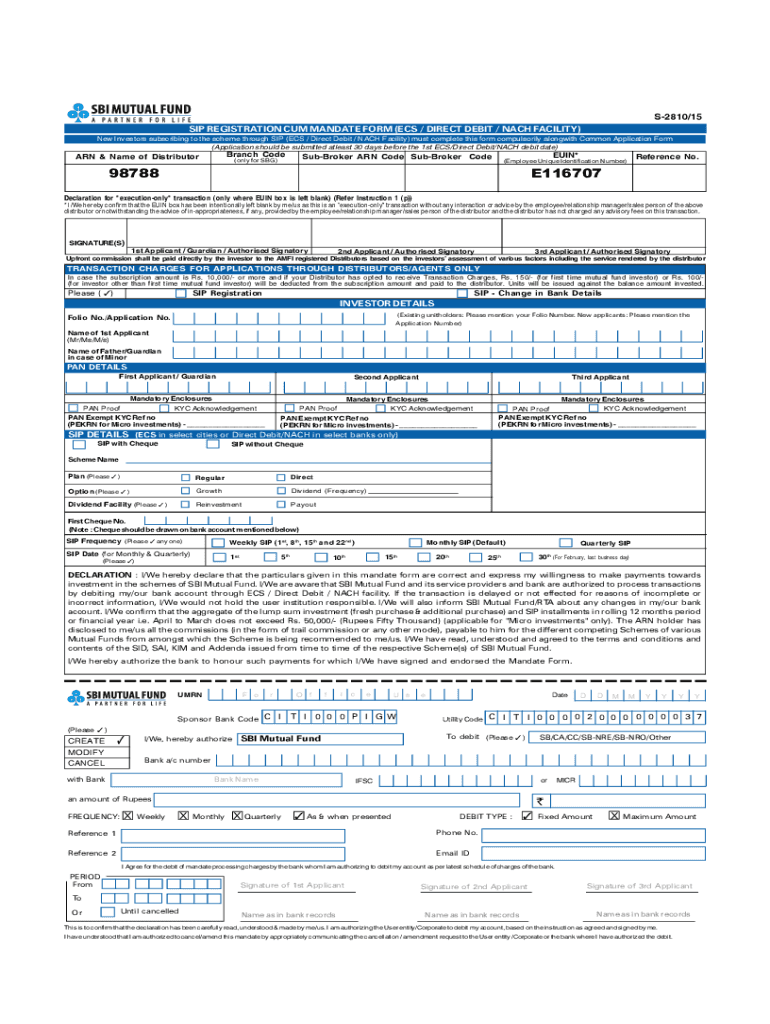 S2810/15SIP REGISTRATION CUM MANDATE FORM (ECS / DIRECT DEBIT / NACH FACILITY) New Investors subscribing to the scheme through SIP (ECS / Direct Debit / NACH Facility) must complete this form compulsorily