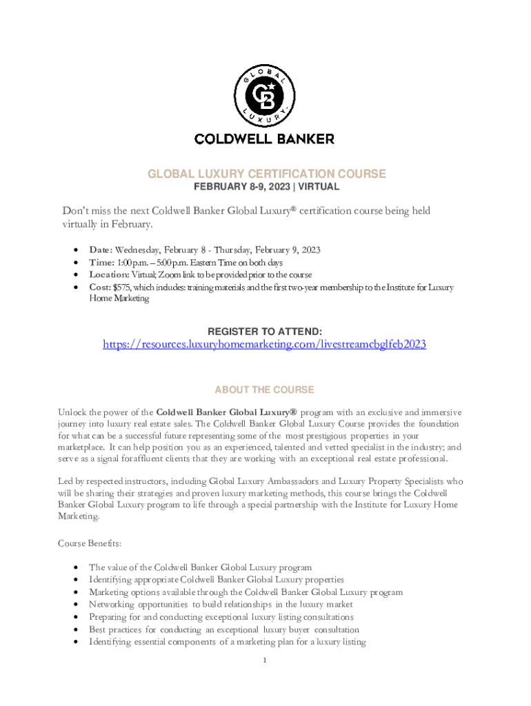 GLOBAL LUXURY CERTIFICATION COURSE FEBRUARY 89, 2023 | VIRTUALDont miss the next Coldwell Banker Global Luxury certification course being held virtually in February. Date: Wednesday, February 8 Thursday,