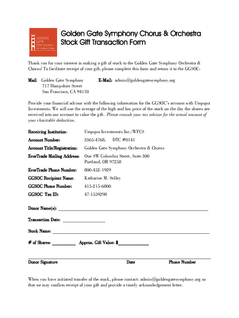 Golden Gate Symphony Chorus & Orchestra Stock Gift Transaction Form Thank you for your interest in making a gift of stock to the Golden Gate Symphony Orchestra & Chorus! To facilitate receipt of your