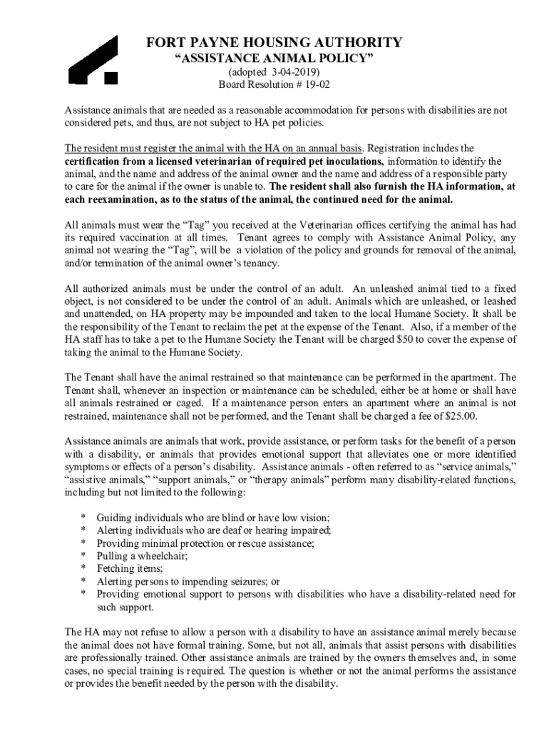 FORT PAYNE HOUSING AUTHORITY ASSISTANCE ANIMAL POLICY (adopted 3042019) Board Resolution # 1902 Assistance animals that are needed as a reasonable accommodation for persons with disabilities are not