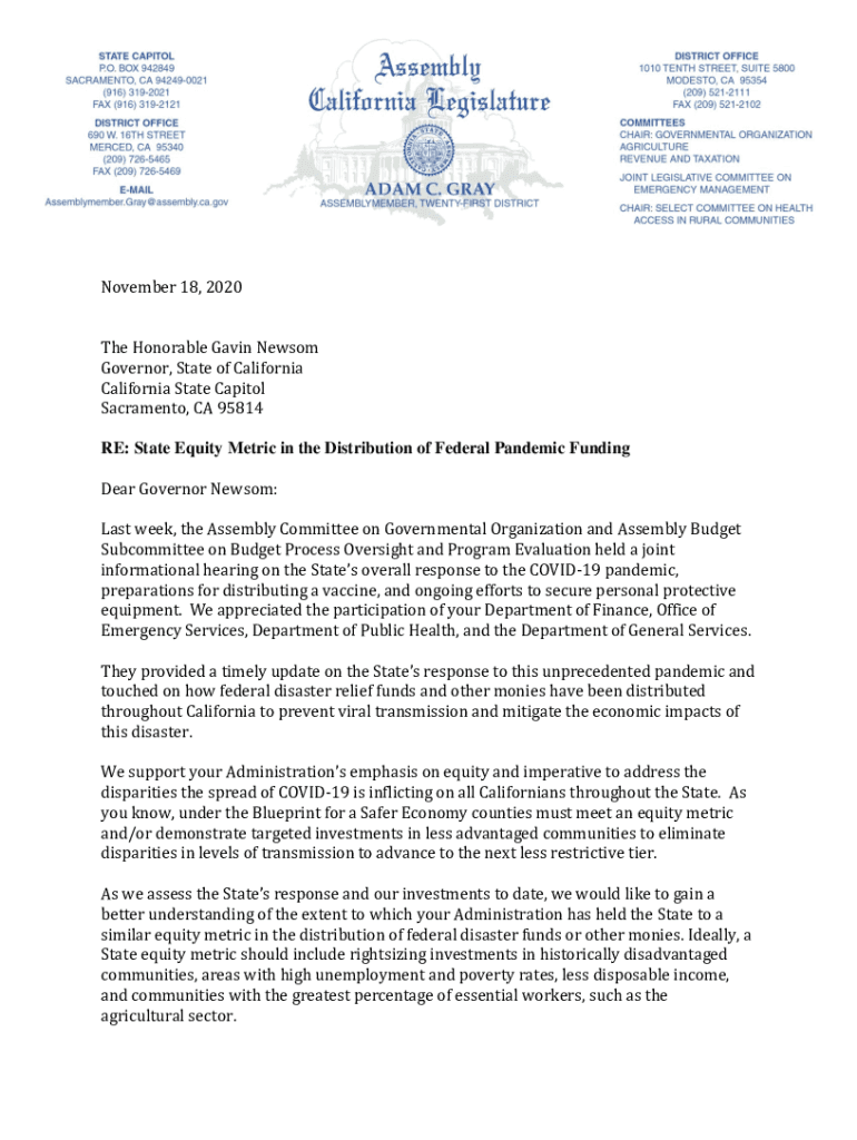 November 18, 2020 The Honorable Gavin Newsom Governor, State of California California State Capitol Sacramento, CA 95814 RE: State Equity Metric in the Distribution of Federal Pandemic Funding Dear