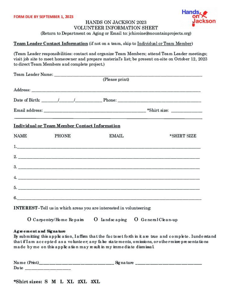 FORM DUE BY SEPTEMBER 1, 2023HANDS ON JACKSON 2023 VOLUNTEER INFORMATION SHEET(Return to Department on Aging or Email to: jchicoine@mountainprojects.org) Team Leader Contact Information (if not on