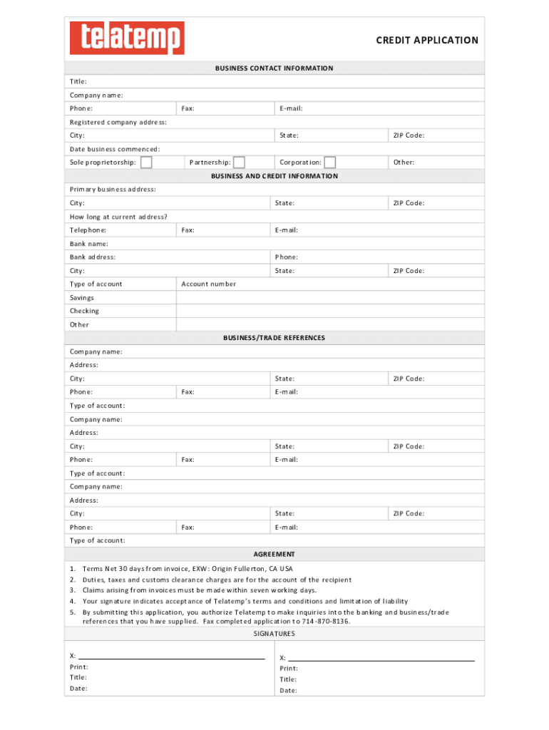 CREDIT APPLICATION BUSINESS CONTACT INFORMATION Title: Company name: Phone:Fax:Email:Registered company address: City:State:ZIP Code:Corporation:Other:Date business commenced: Sole proprietorship:Partnership:BUSINESS