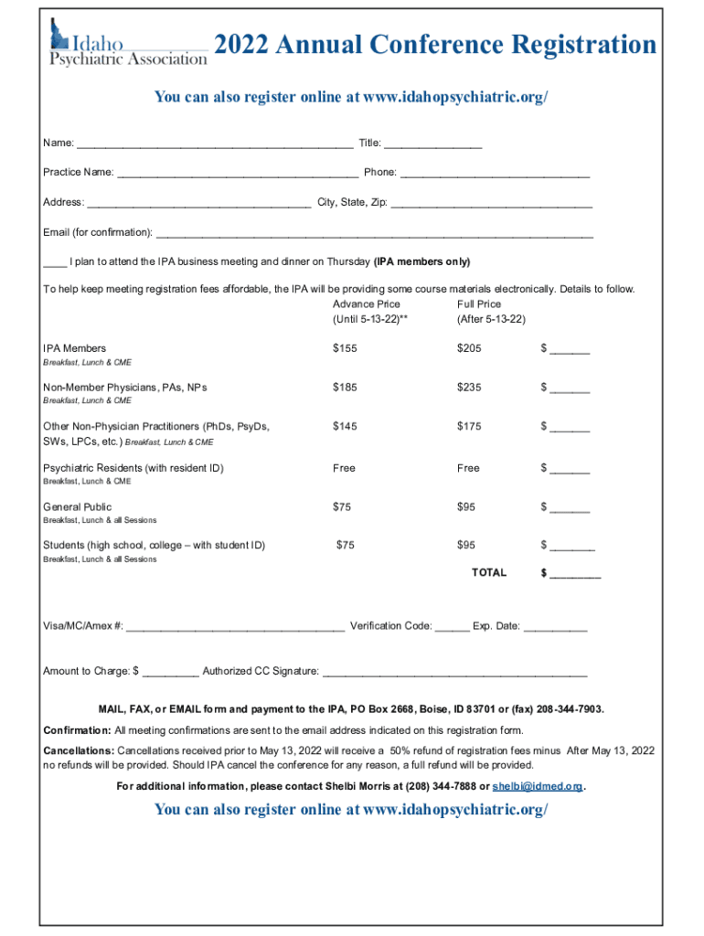 2022 Annual Conference Registration You can also register online at www.idahopsychiatric.org/ Name: ___ Title: ___ Practice Name: ___ Phone: ___ Address: ___ City, State, Zip: ___ Email (for confirmation):