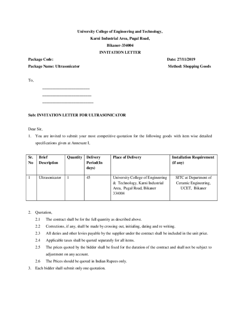 University College of Engineering and Technology, Karni Industrial Area, Pugal Road, Bikaner334004 INVITATION LETTER Package Code:Date: 27/11/2019Package Name: UltrasonicatorMethod: Shopping GoodsTo,
