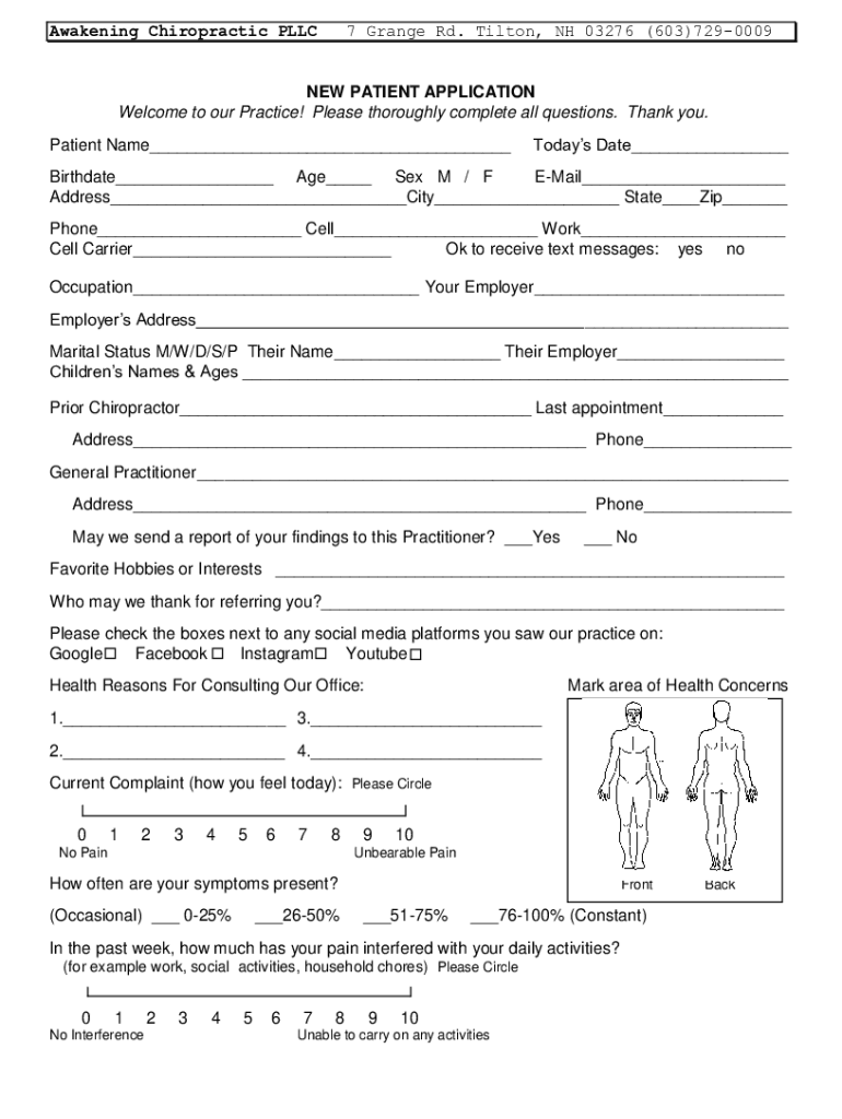 Awakening Chiropractic PLLC7 Grange Rd. Tilton, NH 03276 (603)7290009NEW PATIENT APPLICATION Welcome to our Practice! Please thoroughly complete all questions. Thank you. Patient Name___Todays Date___Birthdate___