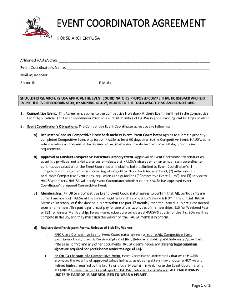 EVENT COORDINATOR AGREEMENT HORSE ARCHERY USAAffiliated HAUSA Club: ___ Event Coordinators Name: ___ Mailing Address: ___ Phone #: ___ EMail: ___ SHOULD HORSE ARCHERY USA APPROVE THE EVENT COORDINATORS