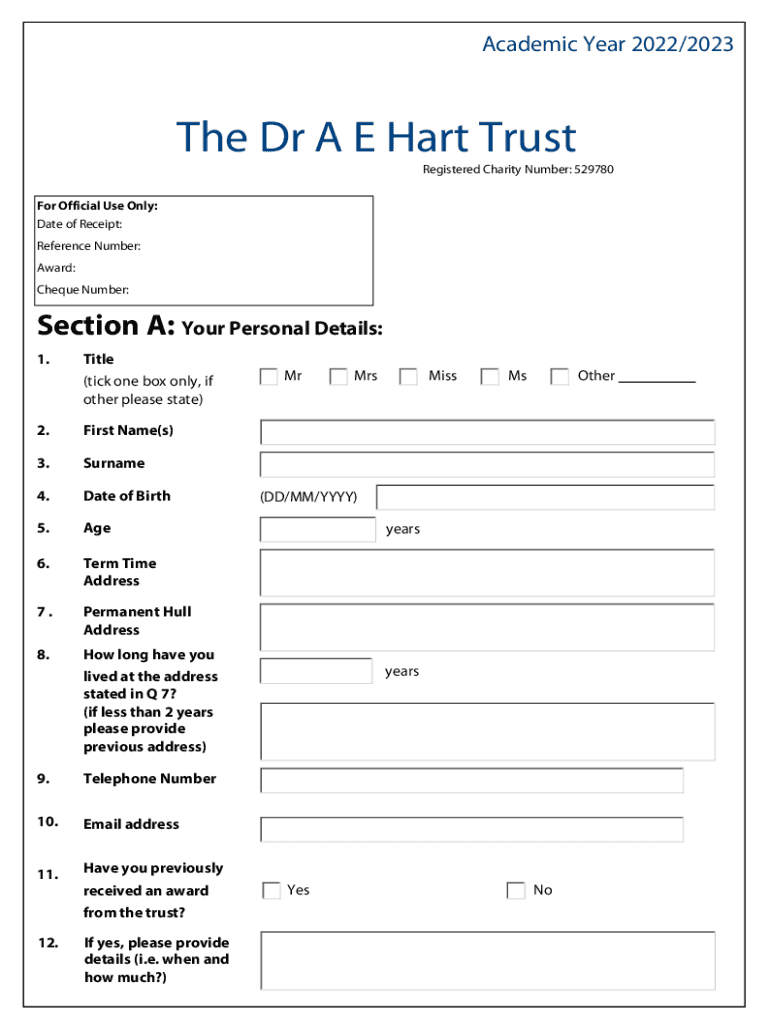 Academic Year 2022/2023The Dr A E Hart Trust Registered Charity Number: 529780 For Official Use Only: Date of Receipt: Reference Number: Award: Cheque Number:Section A: Your Personal Details: 1.Title