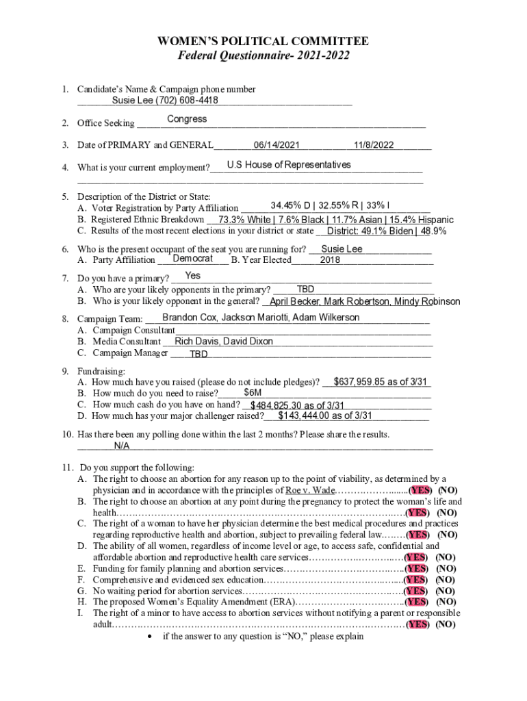 WOMENS POLITICAL COMMITTEE Federal Questionnaire 20212022 1. Candidates Name & Campaign phone number ___ Susie Lee (702) 6084418 Congress 2. Office Seeking ___ 06/14/2021 11/8/2022 3. Date of PRIMARY