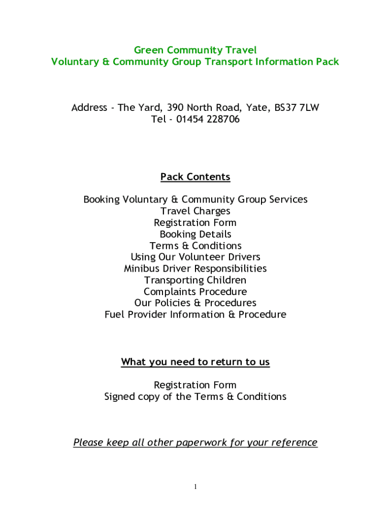 Green Community Travel Voluntary & Community Group Transport Information PackAddress The Yard, 390 North Road, Yate, BS37 7LW Tel 01454 228706Pack Contents Booking Voluntary & Community Group Services