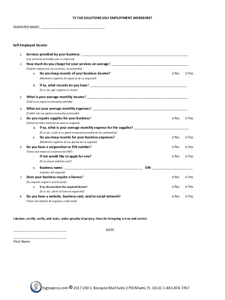 TS TAX SOLUTIONS SELF EMPLOYMENT WORKSHEET TAXPAYER NAME: ___SelfEmployed Income 1.Services provided by your business: ___ (Los servicios prestados por su empresa)2.How much do you charge for your