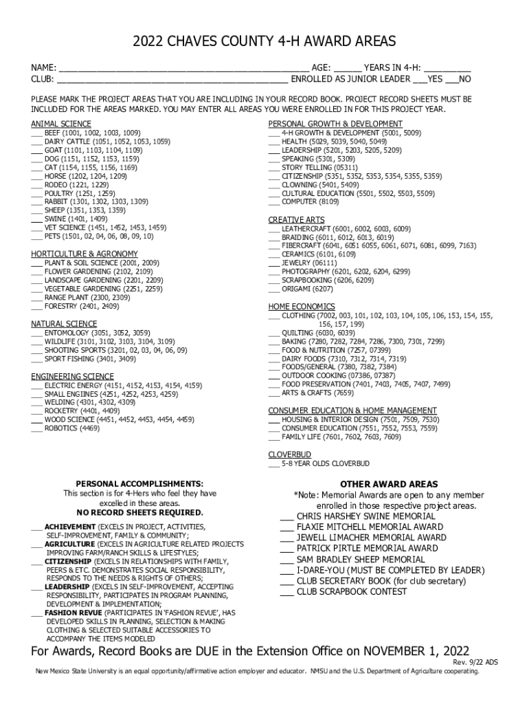 2022 CHAVES COUNTY 4H AWARD AREAS NAME: ___ AGE: ___ YEARS IN 4H: ___ CLUB: ___ ENROLLED AS JUNIOR LEADER ___YES ___NO PLEASE MARK THE PROJECT AREAS THAT YOU ARE INCLUDING IN YOUR RECORD BOOK. PROJECT