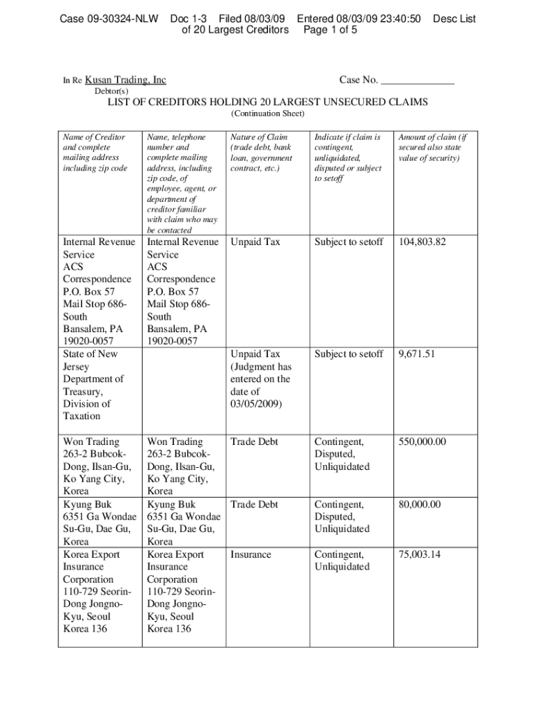 Case 0930324NLWDoc 13 Filed 08/03/09 Entered 08/03/09 23:40:50 of 20 Largest Creditors Page 1 of 5In Re Kusan Trading, Inc Debtor(s)Desc ListCase No. ___LIST OF CREDITORS HOLDING 20 LARGEST UNSECURED