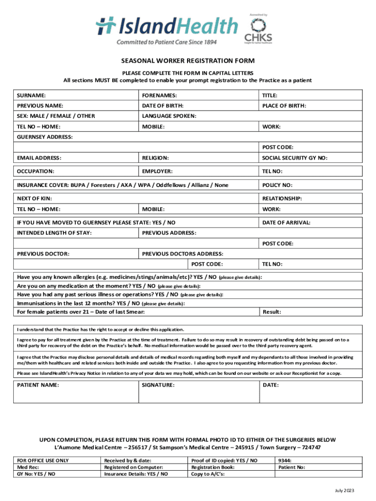 SEASONAL WORKER REGISTRATION FORM PLEASE COMPLETE THE FORM IN CAPITAL LETTERS All sections MUST BE completed to enable your prompt registration to the Practice as a patient SURNAME:FORENAMES:TITLE:PREVIOUS