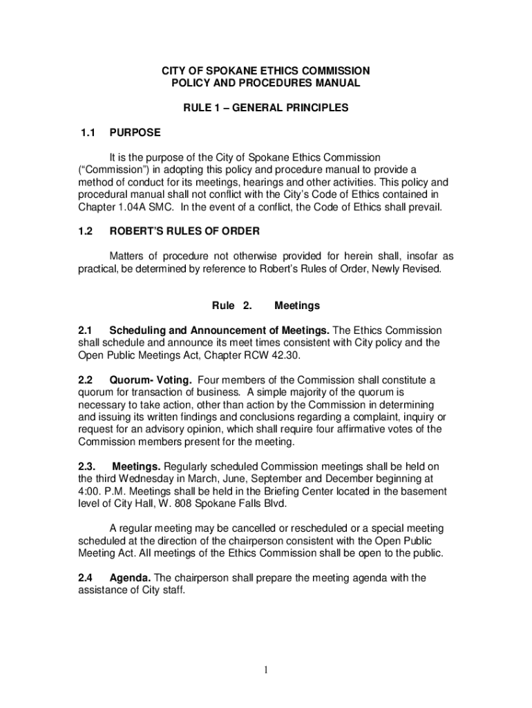 CITY OF SPOKANE ETHICS COMMISSION POLICY AND PROCEDURES MANUAL RULE 1 GENERAL PRINCIPLES 1.1PURPOSEIt is the purpose of the City of Spokane Ethics Commission (Commission) in adopting this policy and