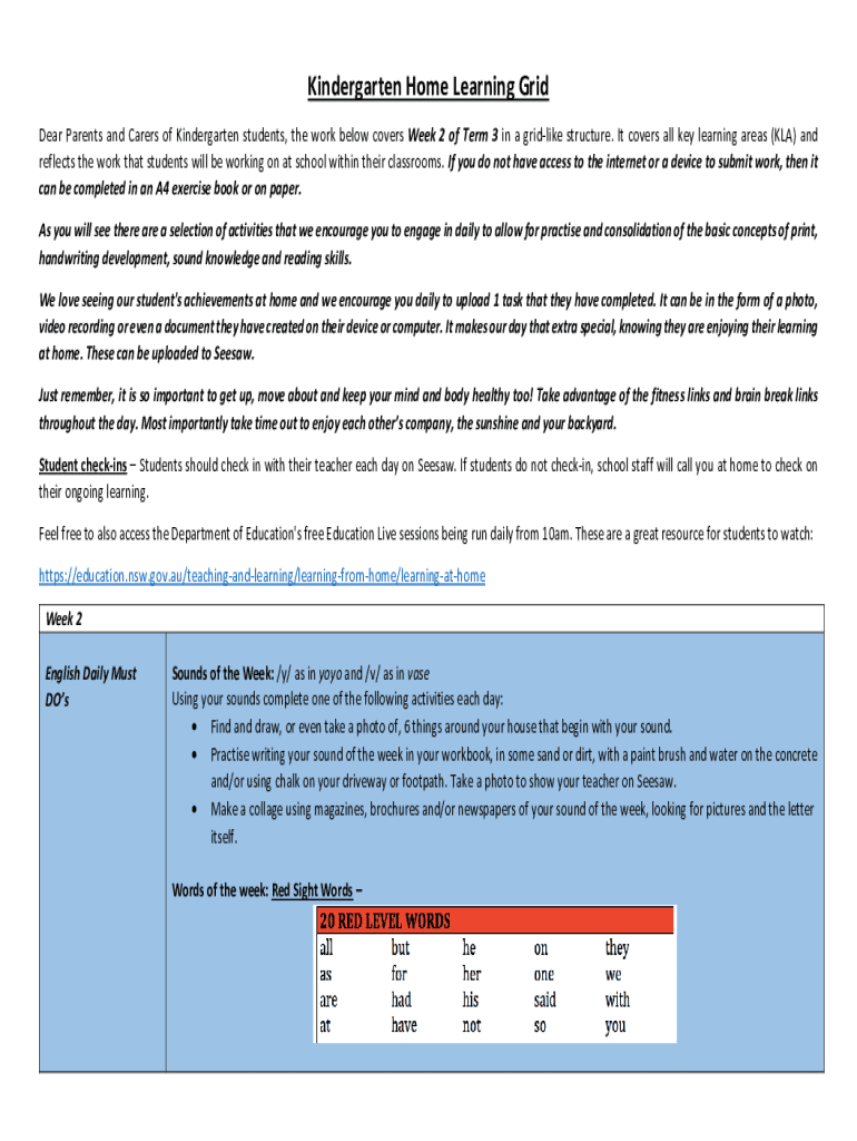 Kindergarten Home Learning Grid Dear Parents and Carers of Kindergarten students, the work below covers Week 2 of Term 3 in a gridlike structure. It covers all key learning areas (KLA) and reflects