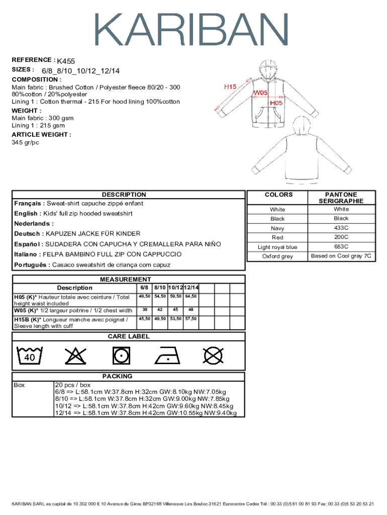 REFERENCE : K455 SIZES :6/8_8/10_10/12_12/14COMPOSITION : Main fabric : Brushed Cotton / Polyester fleece 80/20 300 80%cotton / 20%polyester Lining 1 : Cotton thermal 215 For hood lining 100%cotton
