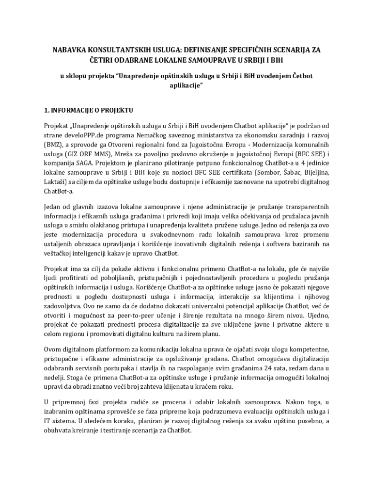 NABAVKA KONSULTANTSKIH USLUGA: DEFINISANJE SPECIFINIH SCENARIJA ZA ETIRI ODABRANE LOKALNE SAMOUPRAVE U SRBIJI I BIH u sklopu projekta Unapreenje optinskih usluga u Srbiji i BiH uvoenjem etbot aplikacije