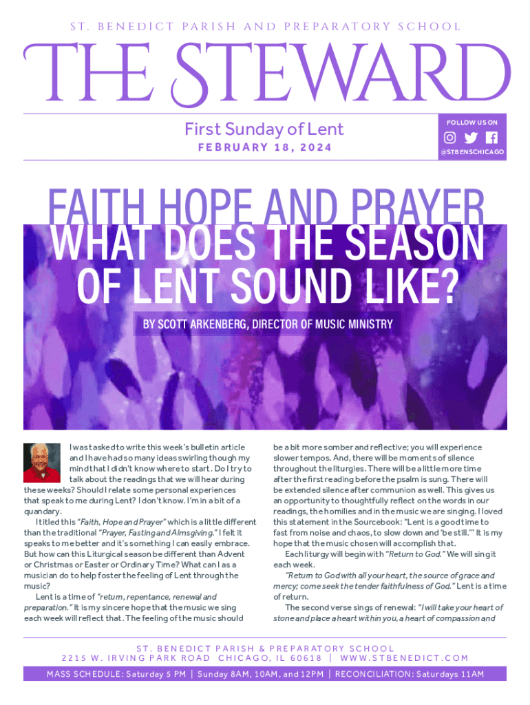 S T. B E N E D I C T PA RI S H A N D P RE PA RAT O RY S C H O O LFirst Sunday of Lent FEBRUARY 18 , 2024FOLLOW US ON@STBENSCHICAGOFAITH HOPE AND PRAYERWHAT DOES THE SEASON OF LENT SOUND LIKE? BY SCOTT