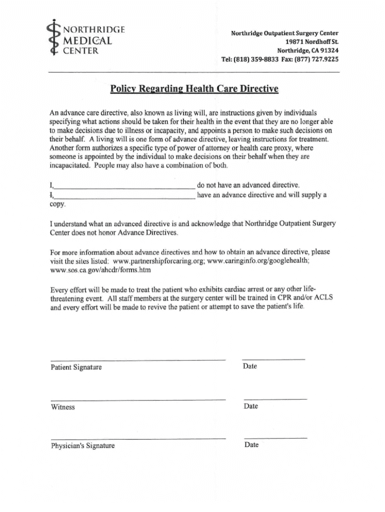 Tel: (818) 3598833 Fax: (877) 727.9225Policy Regarding Health Care Directive