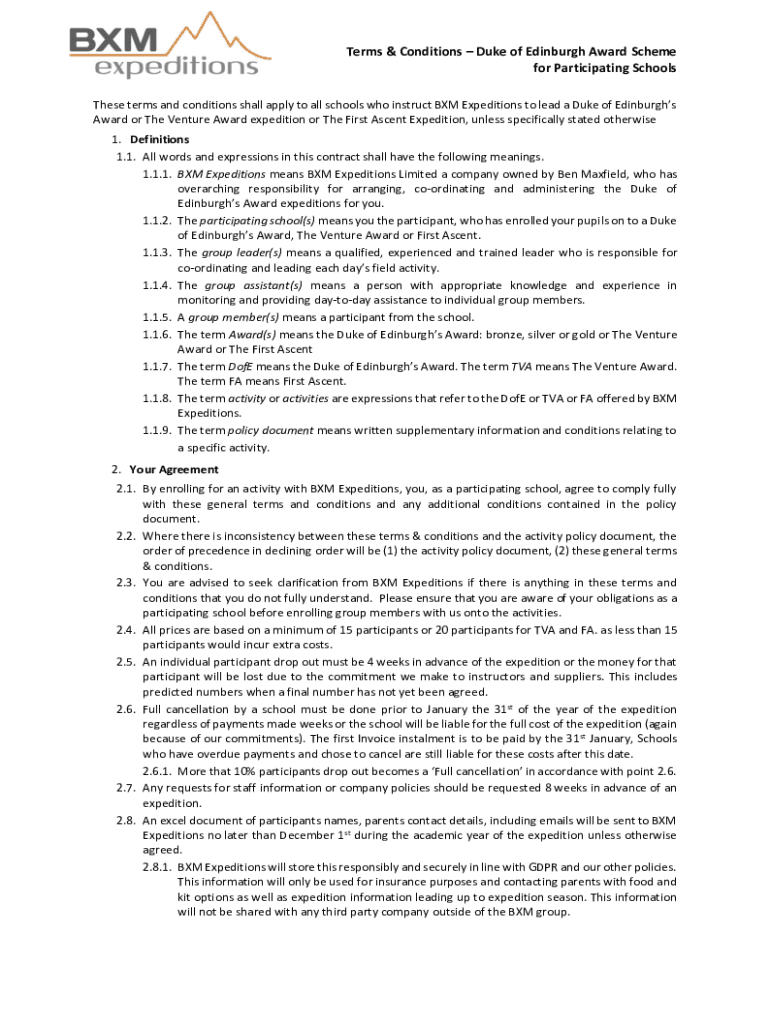 These terms and conditions shall apply to all schools who instruct BXM Expeditions to lead a Duke of Edinburgh's