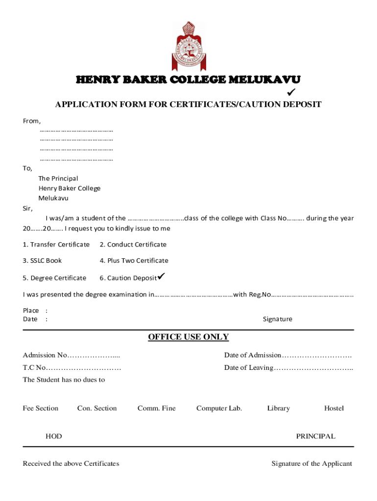 APPLICATION FORM FOR CERTIFICATES/CAUTION DEPOSIT