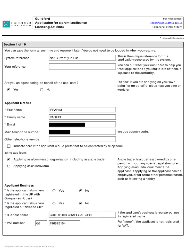 Guildford Application for a premises licence Licensing Act 2003For help contact licensing@guildford.gov.uk Telephone: 01483 444371* required informationSection 1 of 19 You can save the form at any
