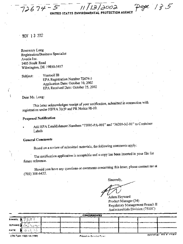 7)6 ttf S / I /1.E/r3 D o;). UNITED STATESENVIRONMETAL PROTECTION AGENcY /15 r cr . NOV 1 3 2002Rosemary Long Registration/Business Specialist AveciaInc. 1405 Foulk Road Wilmington, DE 198505457 Vantocil