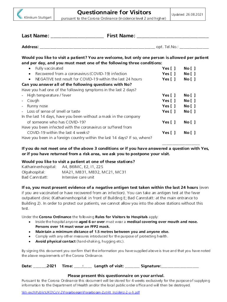 Questionnaire for VisitorsUpdated: 26.08.2021pursuant to the Corona Ordinance (Incidence level 2 and higher)Last Name: ___ First Name: ___