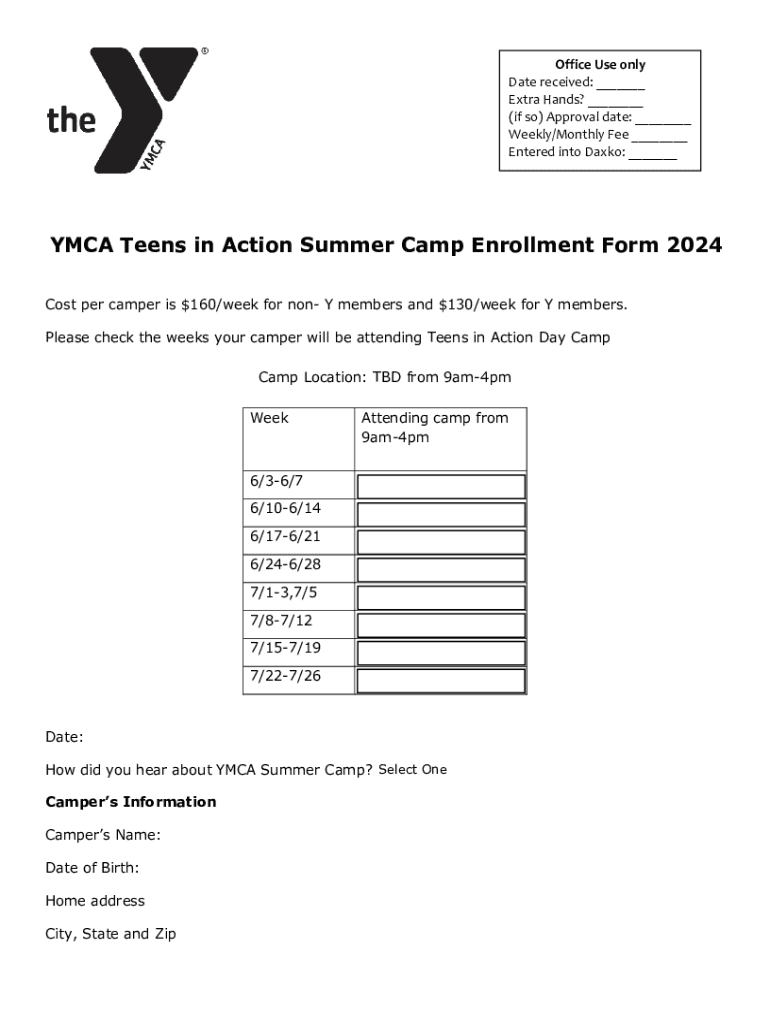 Get the free YMCA Teens in Action Summer Camp Enrollment Form 2024