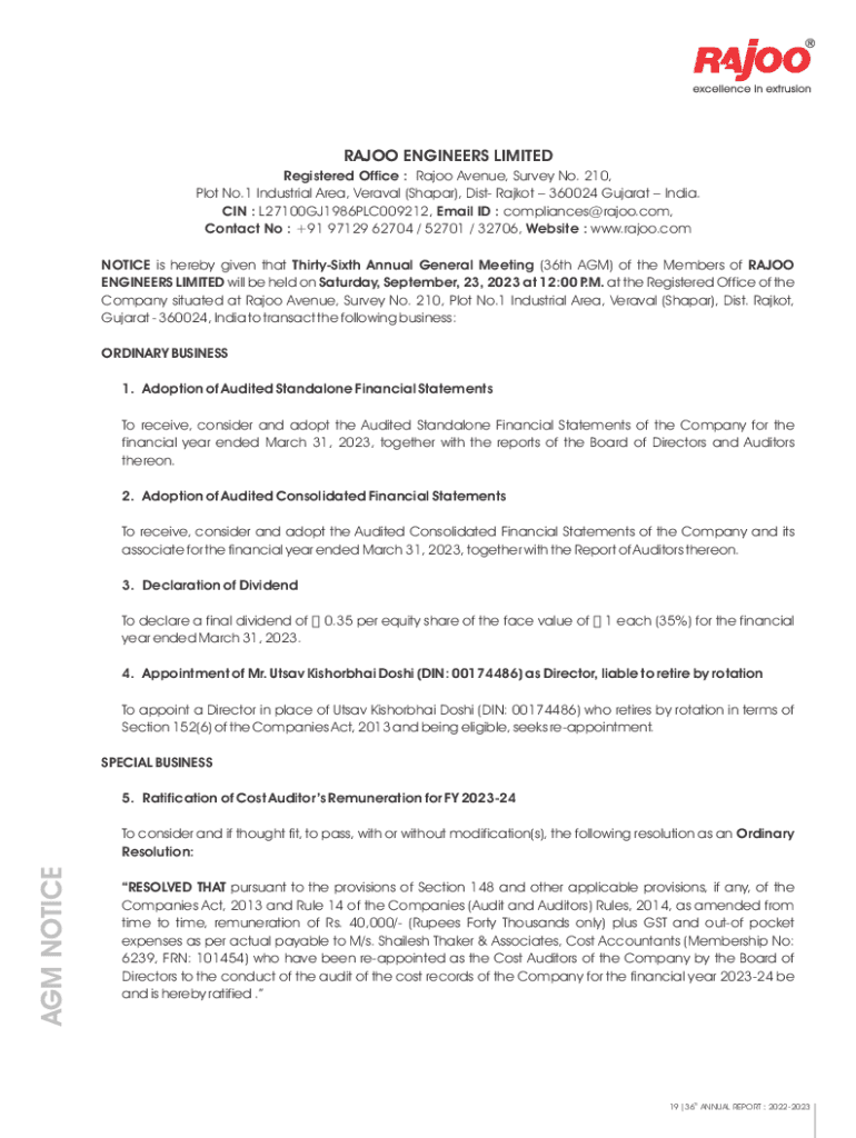 RAJOO ENGINEERS LIMITED Registered Office : Rajoo Avenue, Survey No. 210, Plot No.1 Industrial Area, Veraval (Shapar), Dist Rajkot 360024 Gujarat India. CIN : L27100GJ1986PLC009212, Email ID : compliances@rajoo.com,