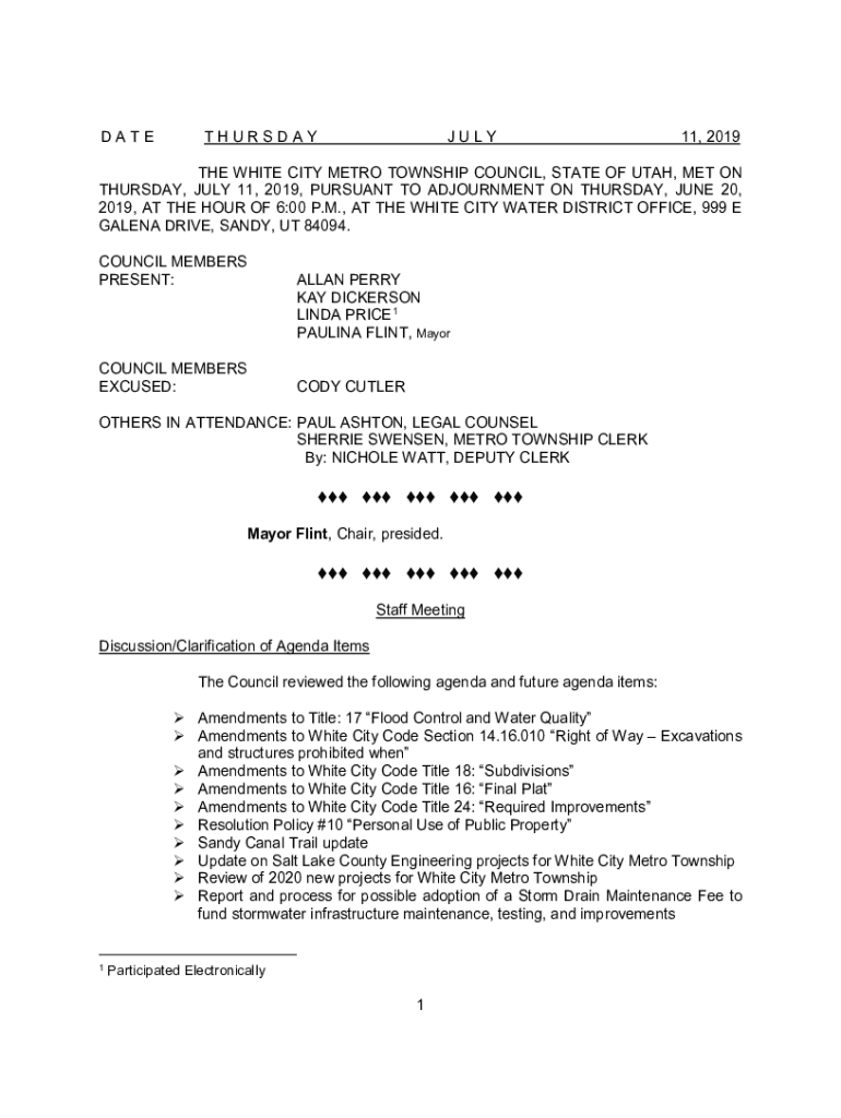 DATETHURSDAYJULY11, 2019THE WHITE CITY METRO TOWNSHIP COUNCIL, STATE OF UTAH, MET ON THURSDAY, JULY 11, 2019, PURSUANT TO ADJOURNMENT ON THURSDAY, JUNE 20, 2019, AT THE HOUR OF 6:00 P.M., AT THE WHITE