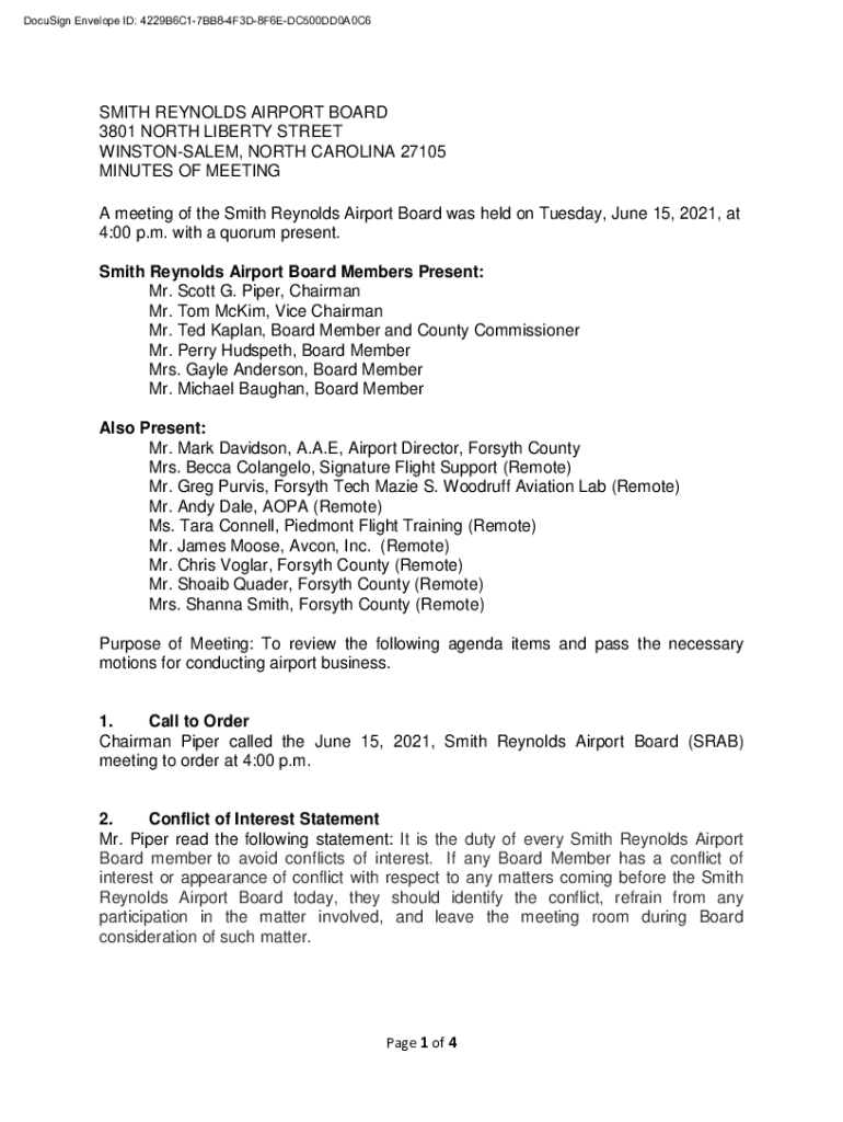 DocuSign Envelope ID: 4229B6C17BB84F3D8F6EDC500DD0A0C6SMITH REYNOLDS AIRPORT BOARD 3801 NORTH LIBERTY STREET WINSTONSALEM, NORTH CAROLINA 27105 MINUTES OF MEETING A meeting of the Smith Reynolds Airport