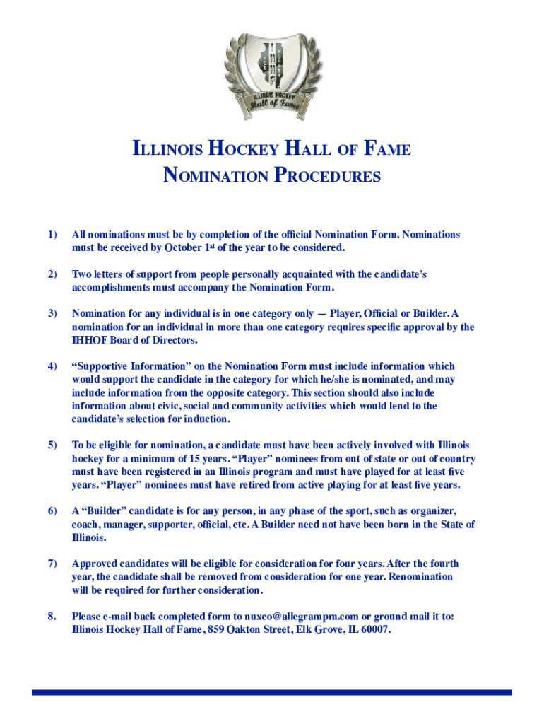 Illinois Hockey Hall of Fame Nomination Procedures 1)All nominations must be by completion of the official Nomination Form. Nominations must be received by October 1st of the year to be considered.2)Two
