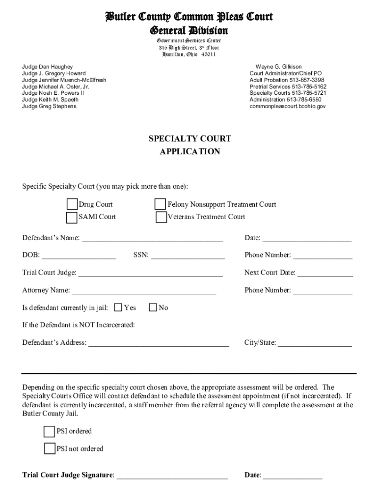 Butler County Common Pleas Court General Division Government Services Center 315 High Street, 3rd Floor Hamilton, Ohio 45011Wayne G. Gilkison Court Administrator/Chief PO Adult Probation 5138873398