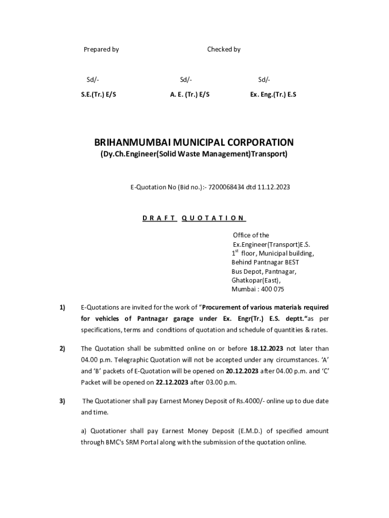 Prepared byChecked bySd/Sd/S.E.(Tr.) E/SSd/A. E. (Tr.) E/SEx. Eng.(Tr.) E.SBRIHANMUMBAI MUNICIPAL CORPORATION (Dy.Ch.Engineer(Solid Waste Management)Transport)EQuotation No (Bid no.): 7200068434 dtd