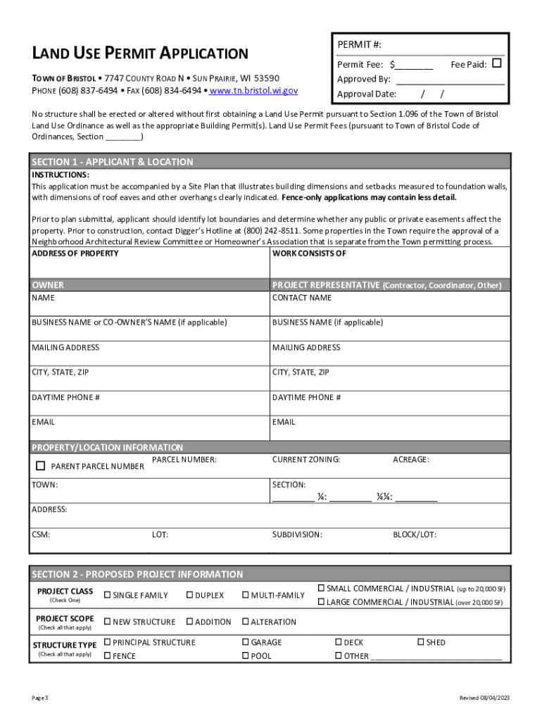 TOWN OF BRISTOL LAND USE PERMIT APPLICATION A Land Use Permit is required prior to obtaining a Town Building Permit. Permits from other regulatory agencies such as Dane County Land & Water Resources,