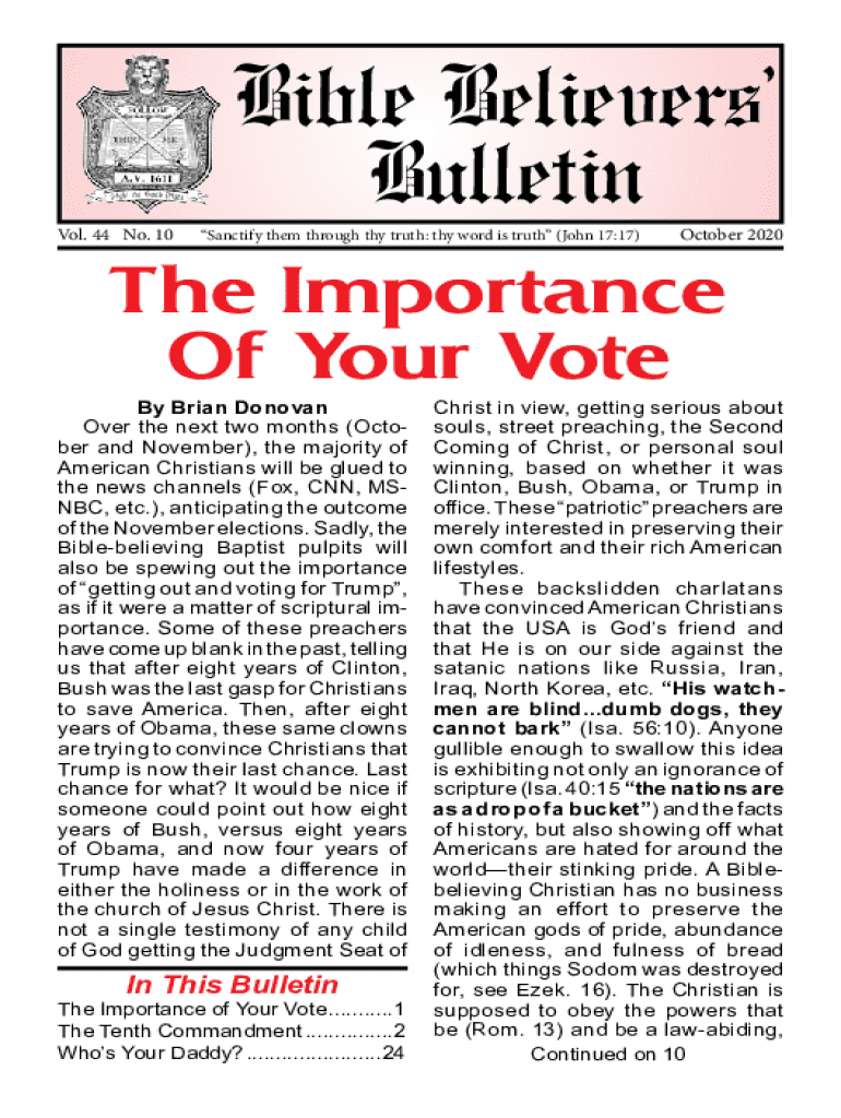 Bible Believers Bulletin BIBLE BELIEVERS BULLETINVol. 44 No. 10October 2020 Page 1Sanctify them through thy truth: thy word is truth (John 17:17)October 2020The Importance Of Your VoteBy Brian Donovan